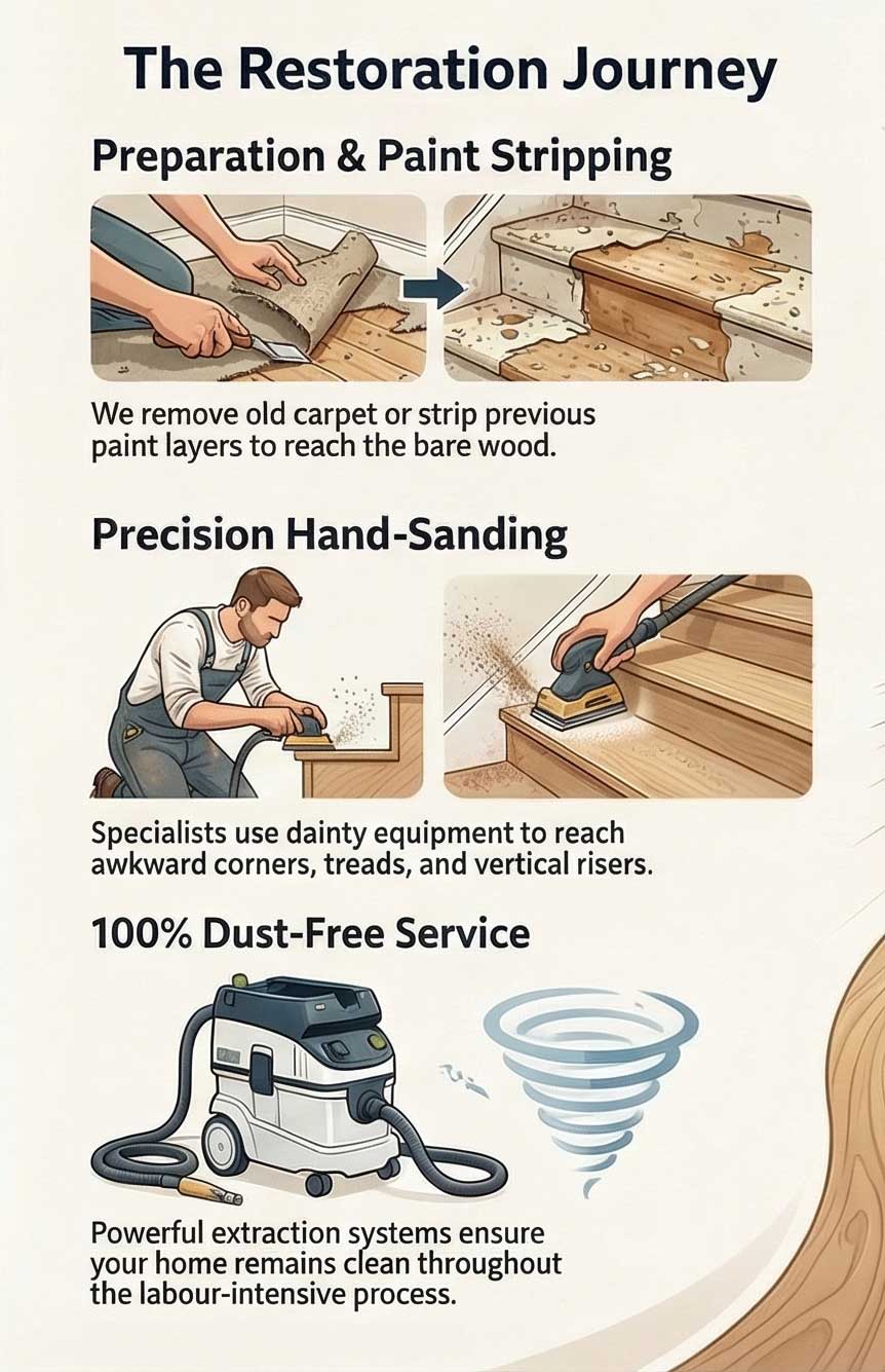 Yes — we can sand only the stair treads (the part you step on) to remove scratches, worn finishes, and dirt build-up, leaving them smooth, clean, and ready for refinishing.