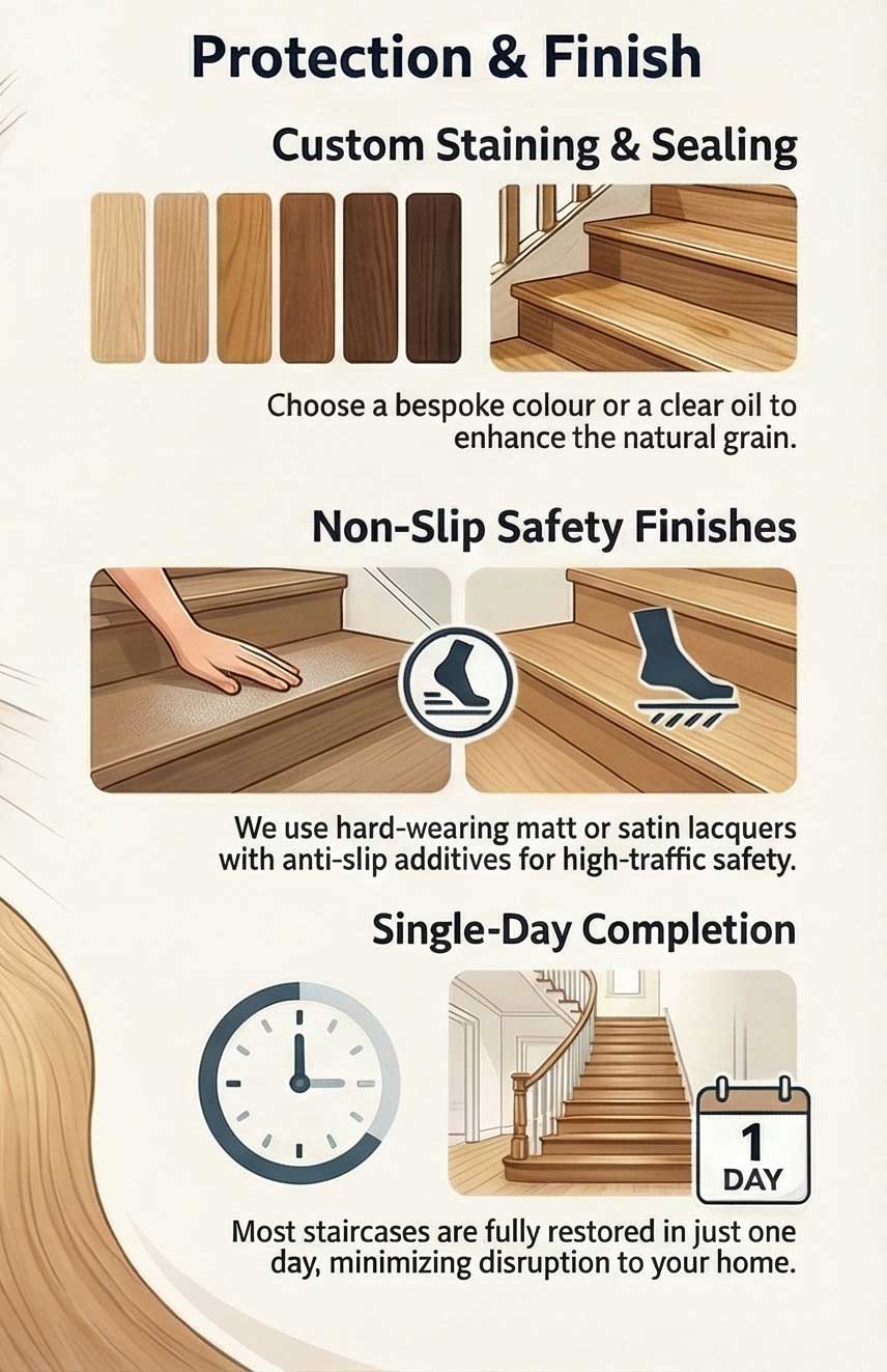 We recommend durable, non-slip finishes such as matt or satin lacquers or hardwax oils with anti-slip additives. These provide both protection and grip, making the stairs safer for daily use.